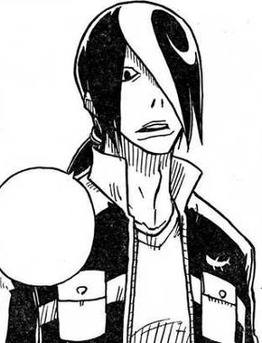 Dash has long black hair which is tied into a pony tail. He has a white swirl pattern on the top and left side of his head.[1]