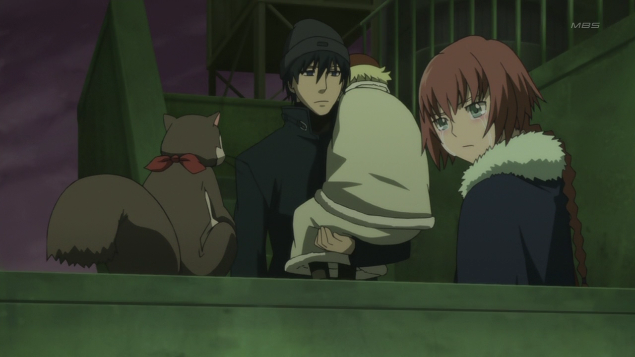 Upon arriving in Japan, Hei begins to train Suou as an agent for his employer. During her sniper training, Suou becomes angry with Hei and points her rifle at him, prompting Mao to make fun of how big she was for wanting to kill someone who was just nagging her. Suou later tells Mao that she wants to leave and go find her brother, but cannot as she doesn't have enough money. During a practice mission where Suou gets in to a scuffle with Norio's gang, the police arrive and Hei throws Mao at the police officers so that Suou can escape. He eventually accompanies her back to the hotel they are staying at.[7]